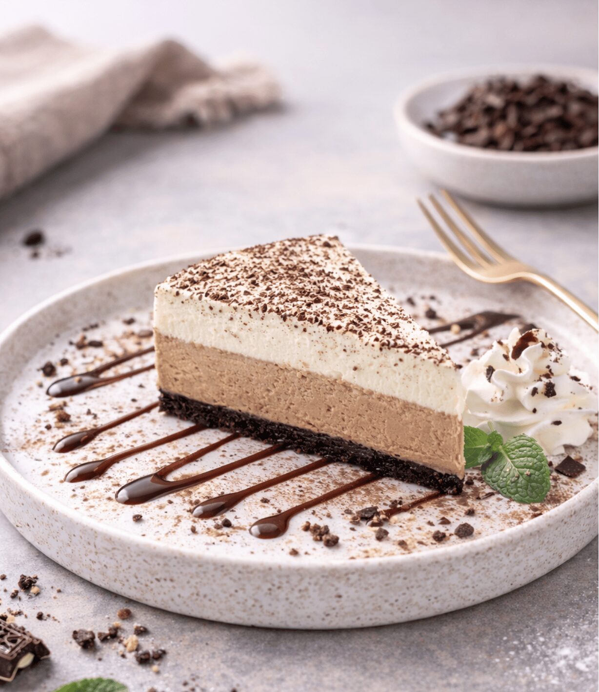 Nuestro Cappuccino Cheesecake combina 25% de queso crema, 16% de nata, harina de trigo, huevo, mantequilla y cacao en polvo, con un toque de vainilla y café para un sabor equilibrado y una textura cremosa.