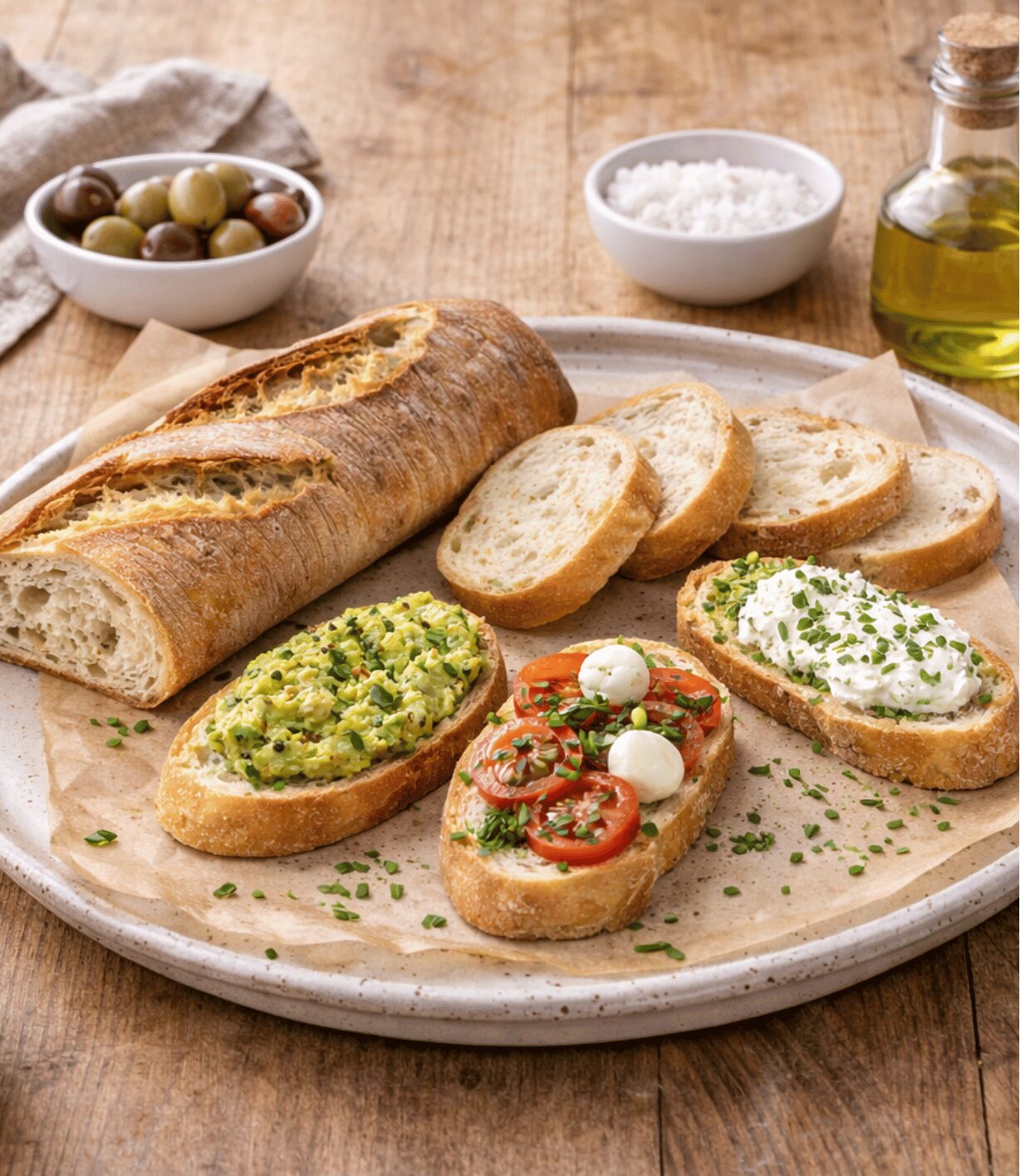 Este pan se caracteriza por su aroma único a aceite de oliva, que le otorga un sabor delicado y refinado. Su fina corteza, espolvoreada con harina, es el toque final que resalta su textura crujiente por fuera y suave por dentro.
