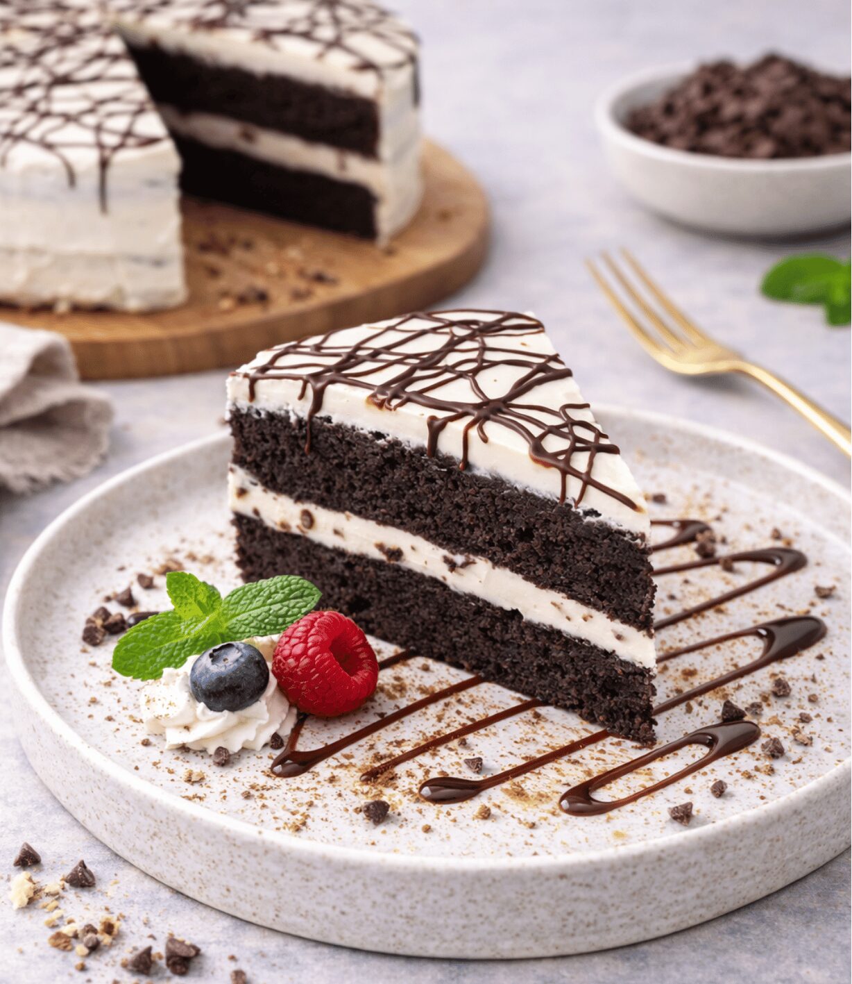 La combinación de cacao de comercio justo, pasta de cacao, y extracto de vainilla le da al pastel un sabor inconfundible que conquistará a todos los amantes del chocolate y las galletas.