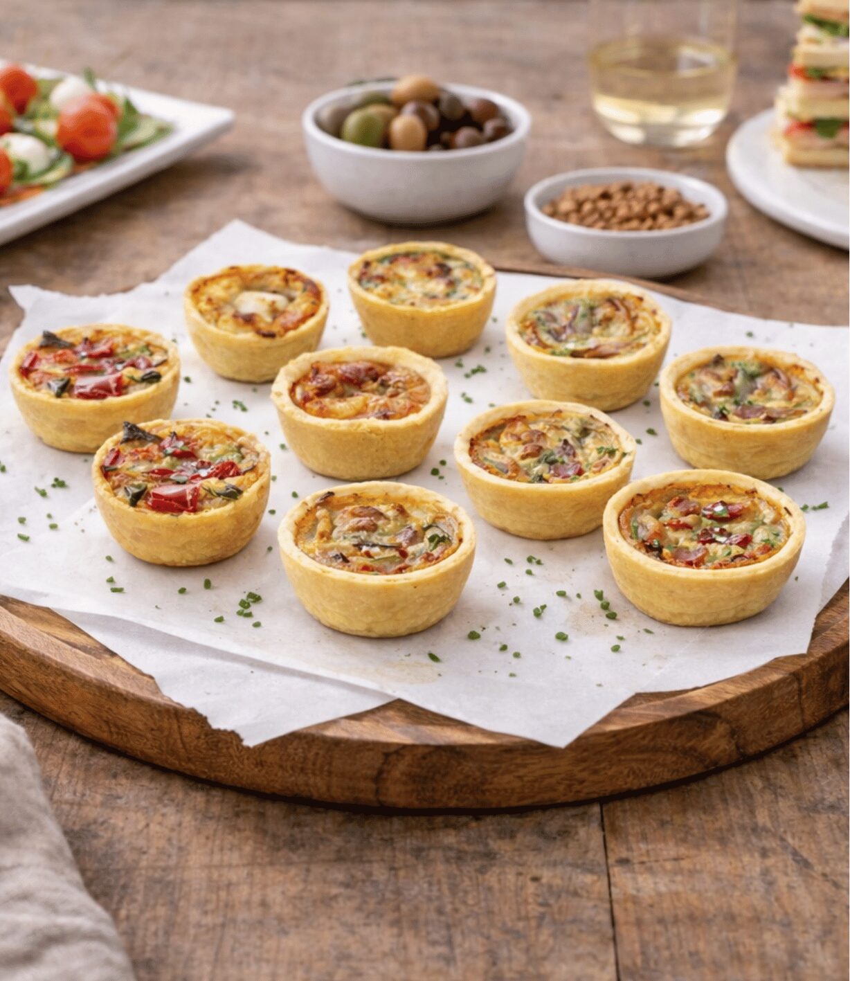 Nuestras Mini Quiches están elaboradas con una base crujiente y un relleno cremoso con ingredientes seleccionados como espinacas, salmón, boletus, perejil, verduras mediterráneas, tomate, queso azul, queso emmental, queso de cabra y miel, ofreciendo una combinación equilibrada de sabores para todo tipo de eventos.