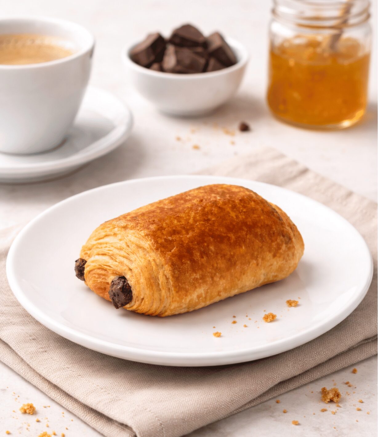 El pan de chocolate 75g es una joya de la bollería que combina una masa de hojaldre crujiente con un relleno de chocolate negro de alta calidad.
