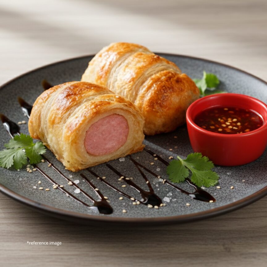 Crafted with premium 100% prime beef sausage, carefully seasoned for a rich and balanced savoury flavour. Wrapped in high-quality puff pastry made with selected wheat flour and butter, delivering delicate, flaky layers and a golden crisp finish. Developed to ensure consistent texture, taste and professional performance.