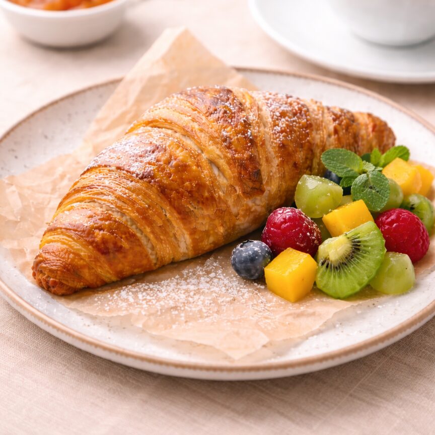 As it bakes, the fine layers expand beautifully, creating a remarkable lift and a perfectly defined honeycomb interior. The result is a croissant with a uniform golden color, a crisp and flaky exterior, and a light, airy crumb that delivers both visual sophistication and exceptional mouthfeel. Its aroma is unmistakably buttery and inviting, reinforcing the perception of freshness and artisanal quality from the very first impression.