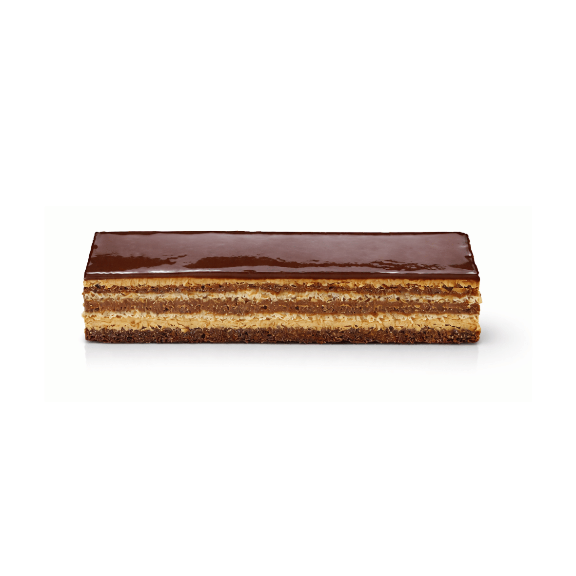La textura refinada del banda Opéra se logra gracias a su delicado bizcocho, que sirve como base perfecta para las capas de ganache de chocolate bitter, crema de mantequilla con café y un glaseado de chocolate que corona esta obra maestra.