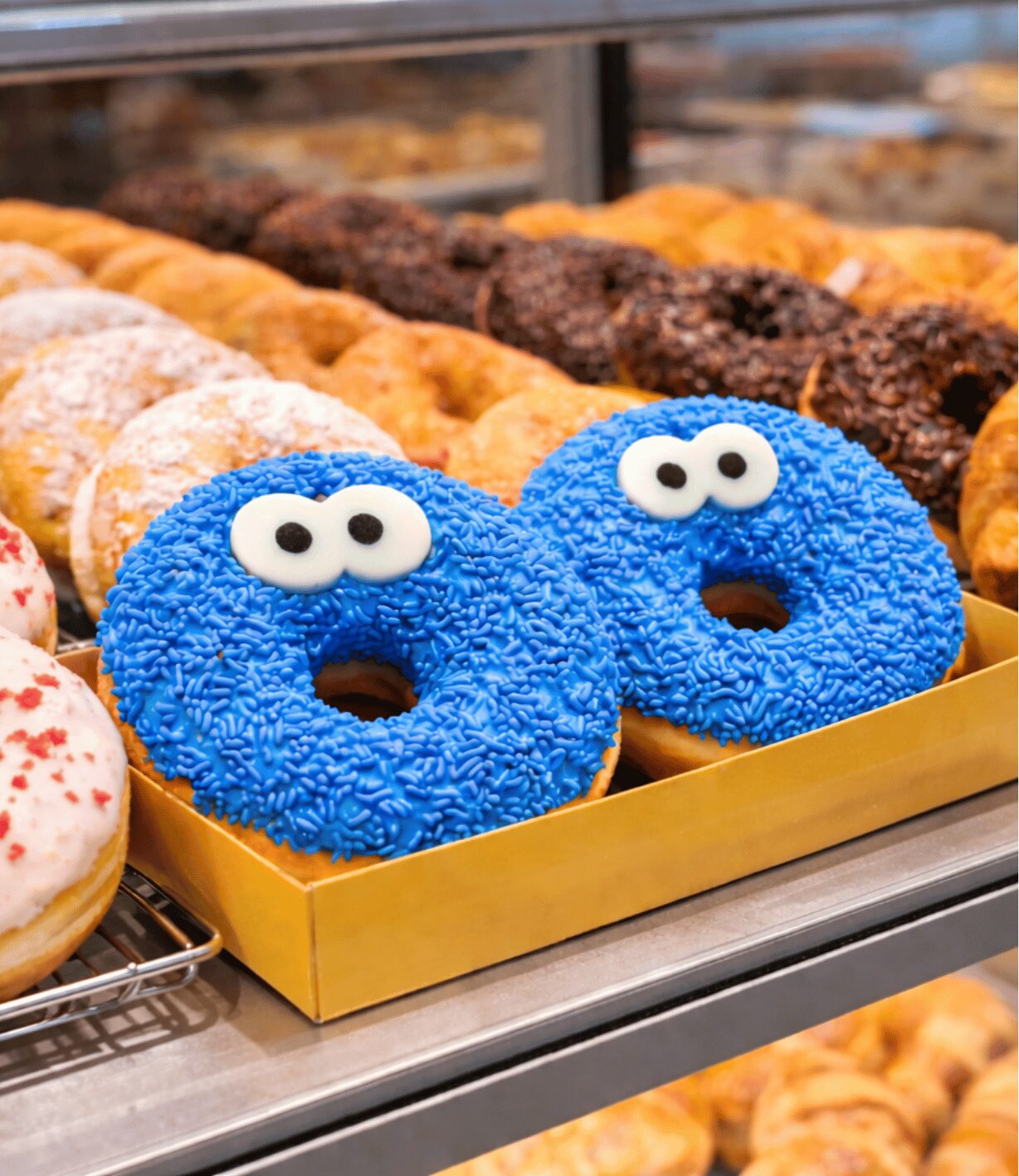 Un donut esponjoso cubierto con un llamativo glaseado azul y decorado con trozos de galleta que aportan textura y un toque divertido. Un producto atractivo y original que destaca fácilmente en vitrinas de cafeterías y rubro retail.