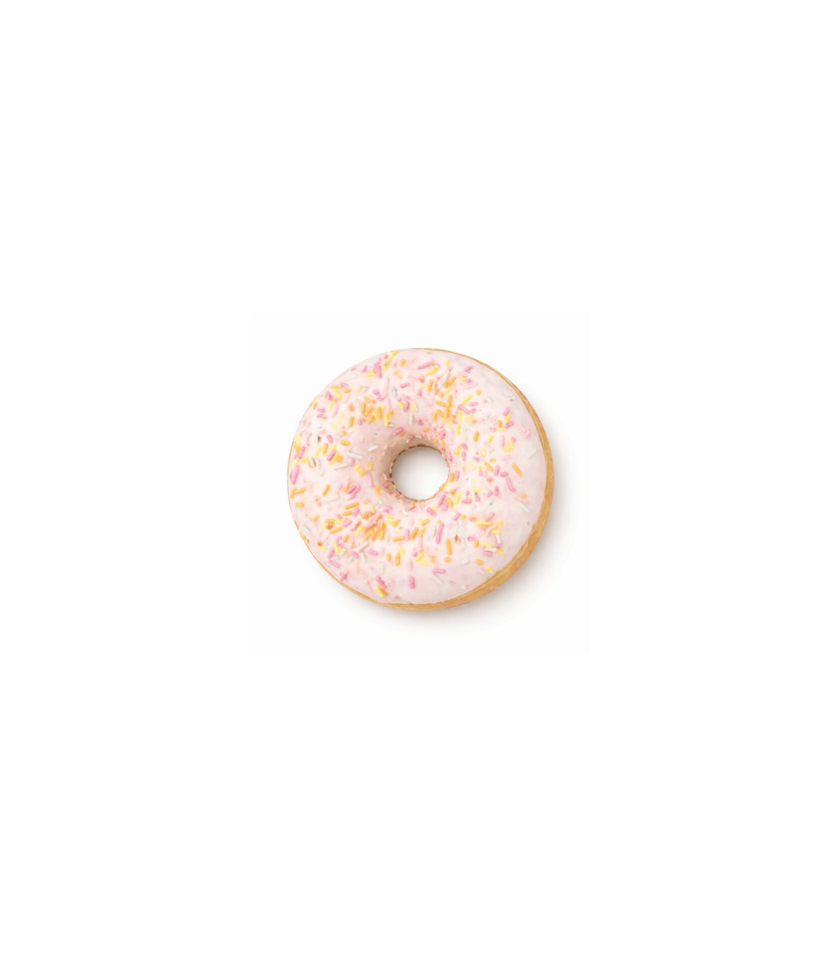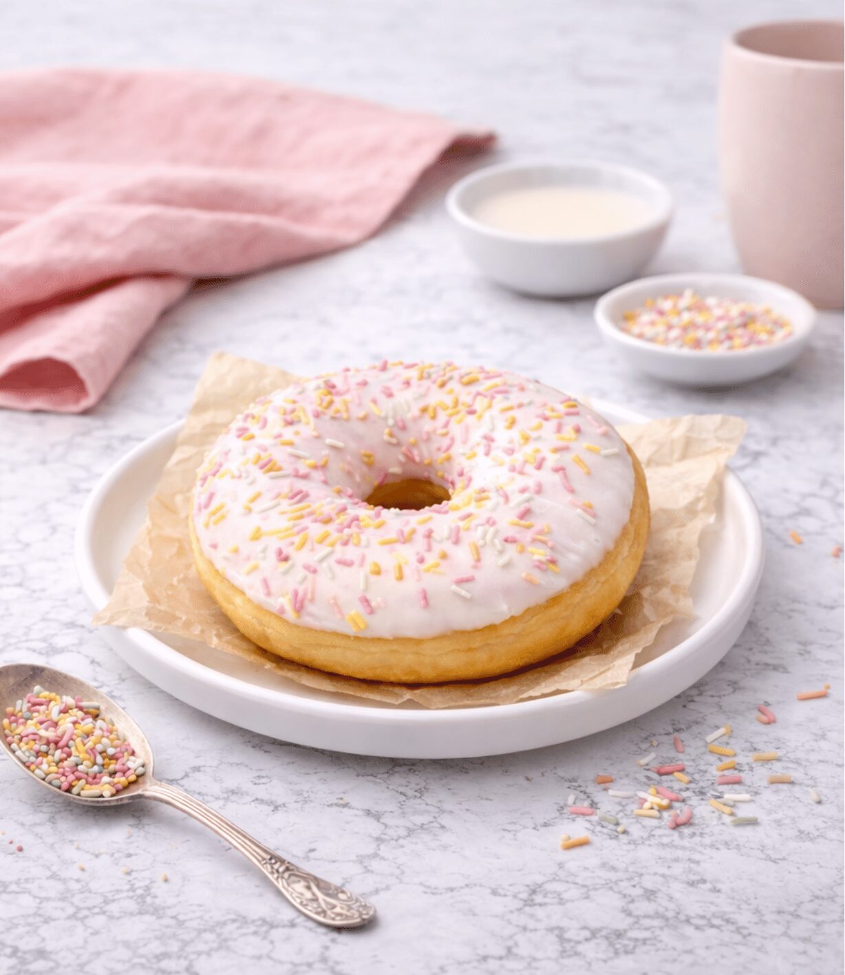 Un donut esponjoso con delicado sabor a vainilla, cubierto con un suave glaseado y decorado con coloridas chispas arcoíris que lo hacen tan atractivo a la vista como delicioso al paladar. Ideal para vitrinas de cafeterías, panaderías y negocios que buscan un producto alegre y llamativo.