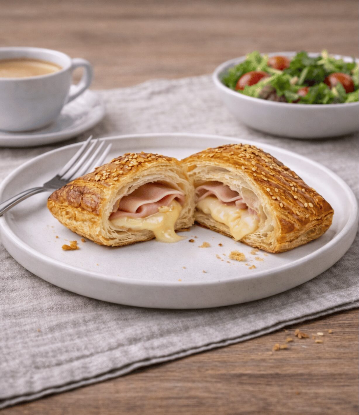 Triángulo hojaldrado relleno de jamón y queso fundente, con exterior dorado y ligeramente crujiente. Su interior combina el sabor suave del jamón con la cremosidad del queso derretido, logrando un equilibrio perfecto entre textura y sabor. Ideal para desayunos, coffee breaks y más.